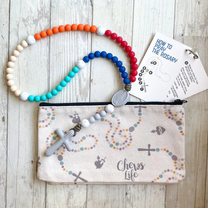The Carlo Rosary from Chews Life is perfect for older children that are getting closer to using a traditional gemstone rosary, but are not quite there yet. It features a different colour for each decade with a light grey cross and medallion.