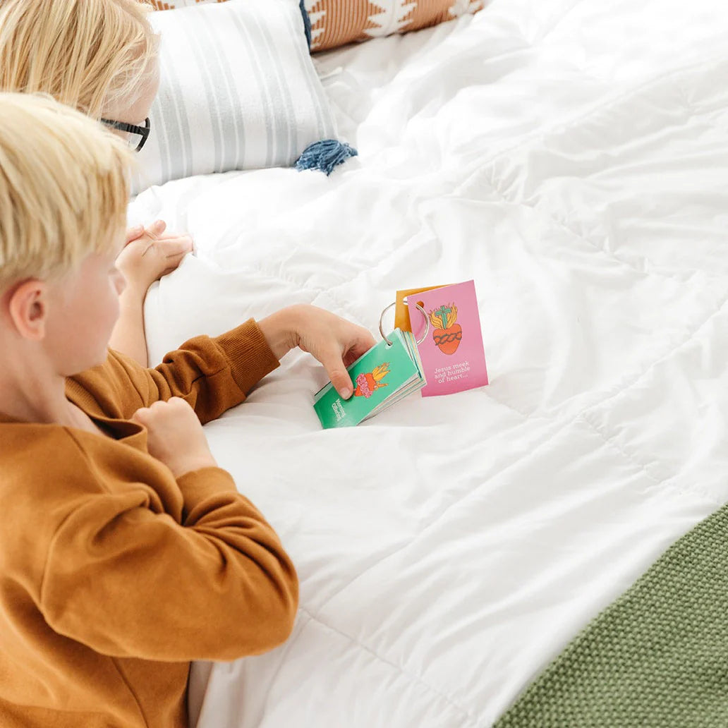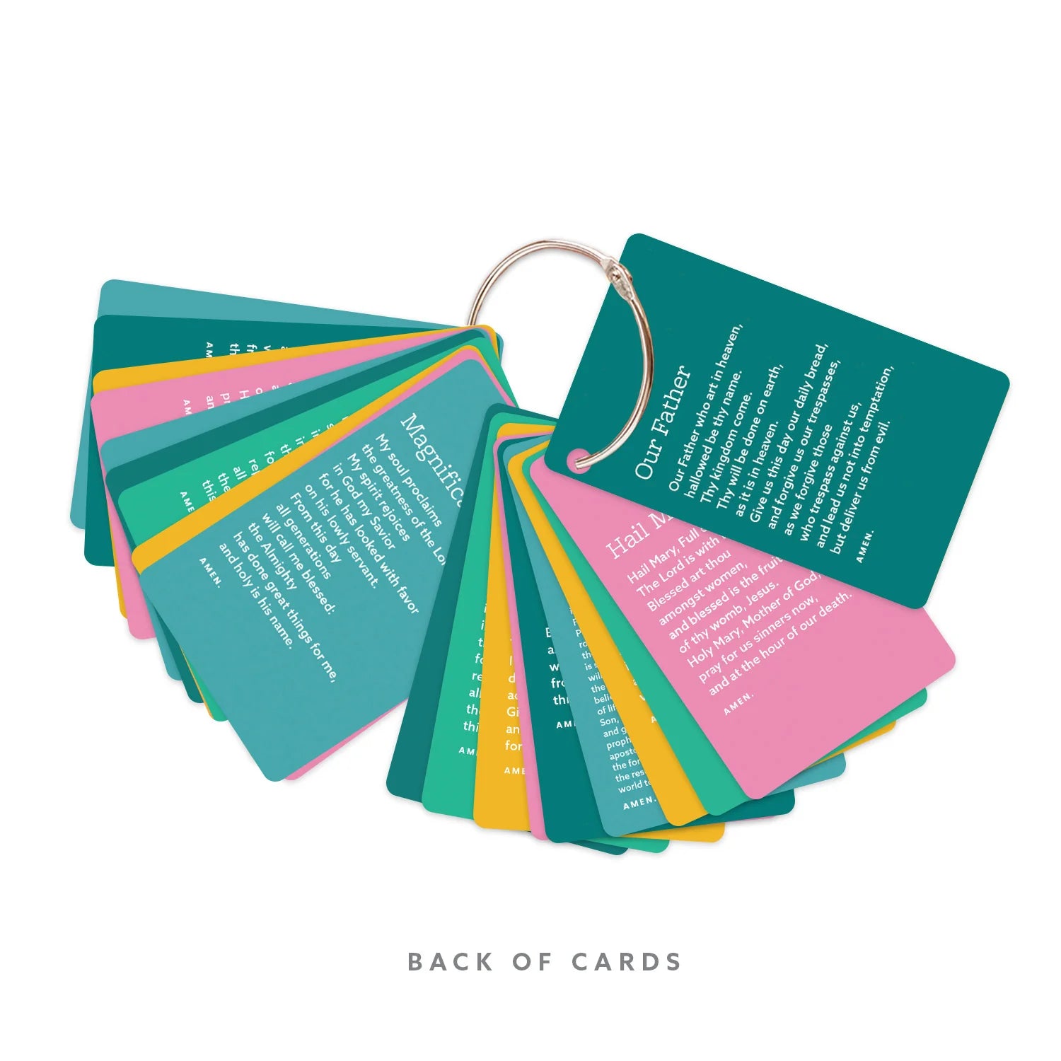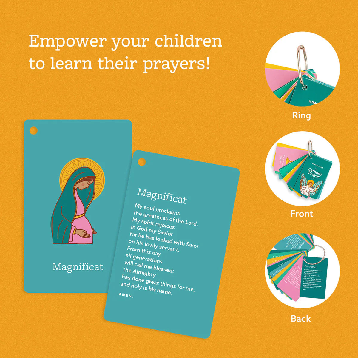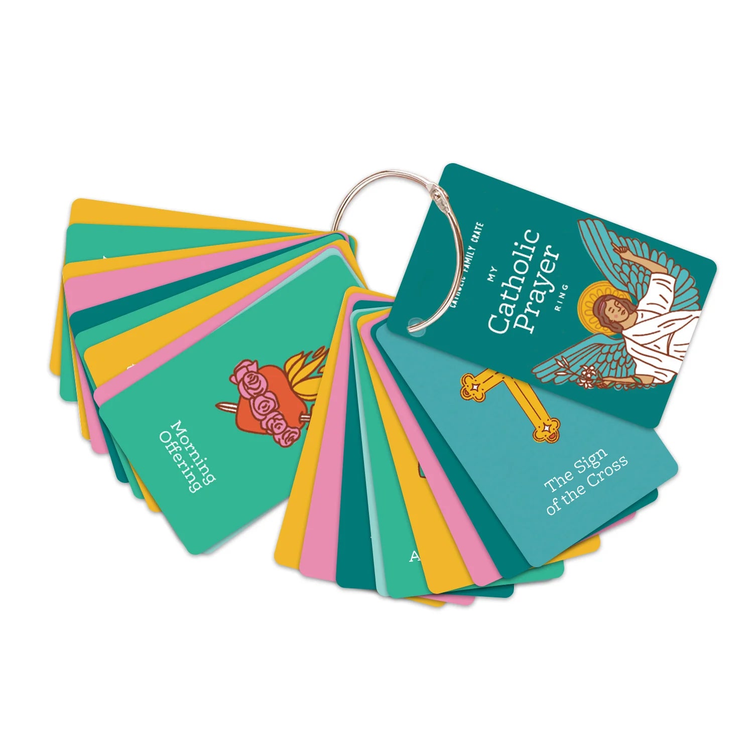 The Catholic Prayer Ring from Catholic Family Crate is perfect for teaching your pint-sized saints the foundational prayers of the Catholic faith. This pocket-sized guide comes on a ring and includes 27 brightly illustrated prayer cards with easy-to-read text, making it easy for kids to learn and recite them. Each card features a specific prayer, providing a convenient and engaging way for children to deepen their prayer life.