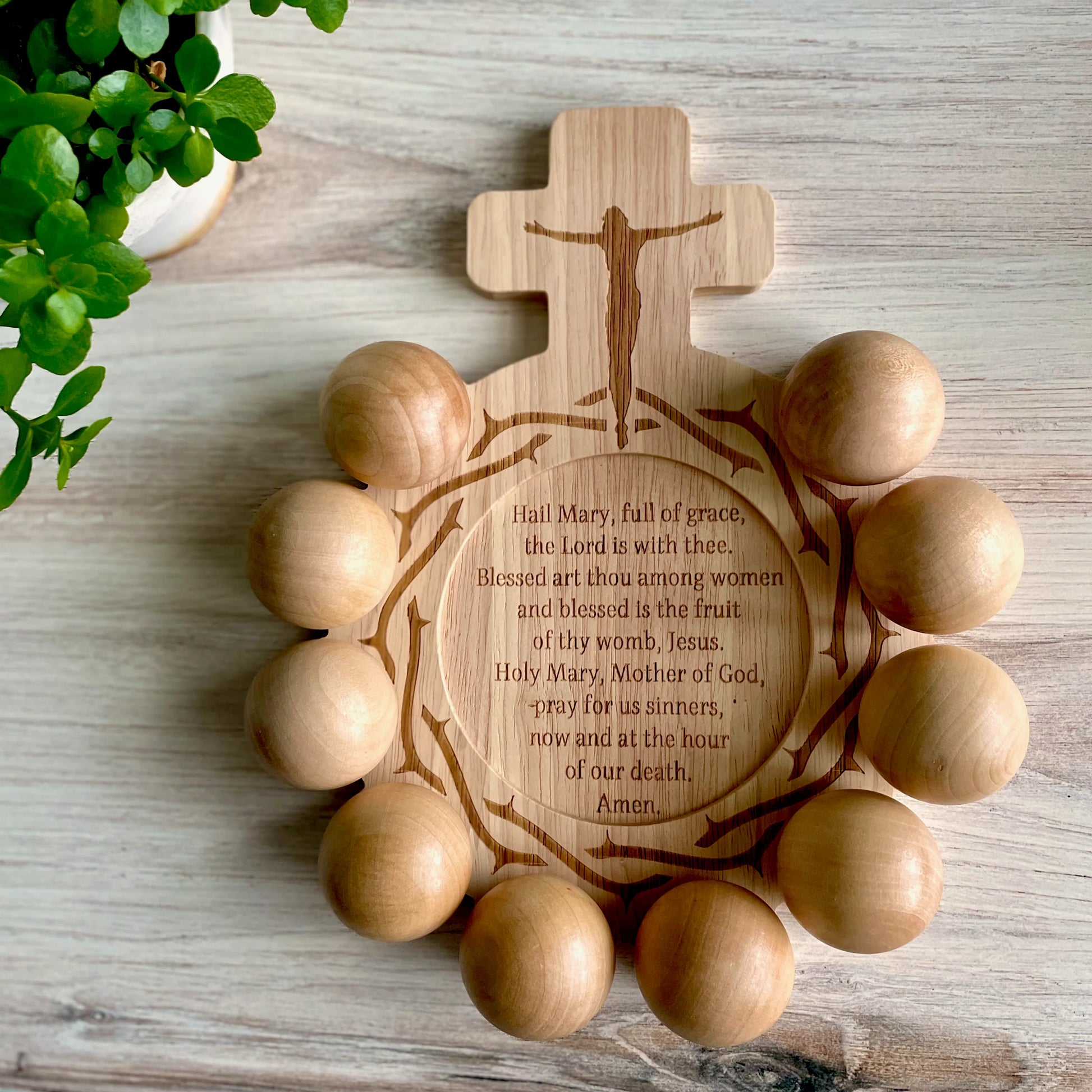 This beautifully crafted wooden board features the Hail Mary engraved into the center.