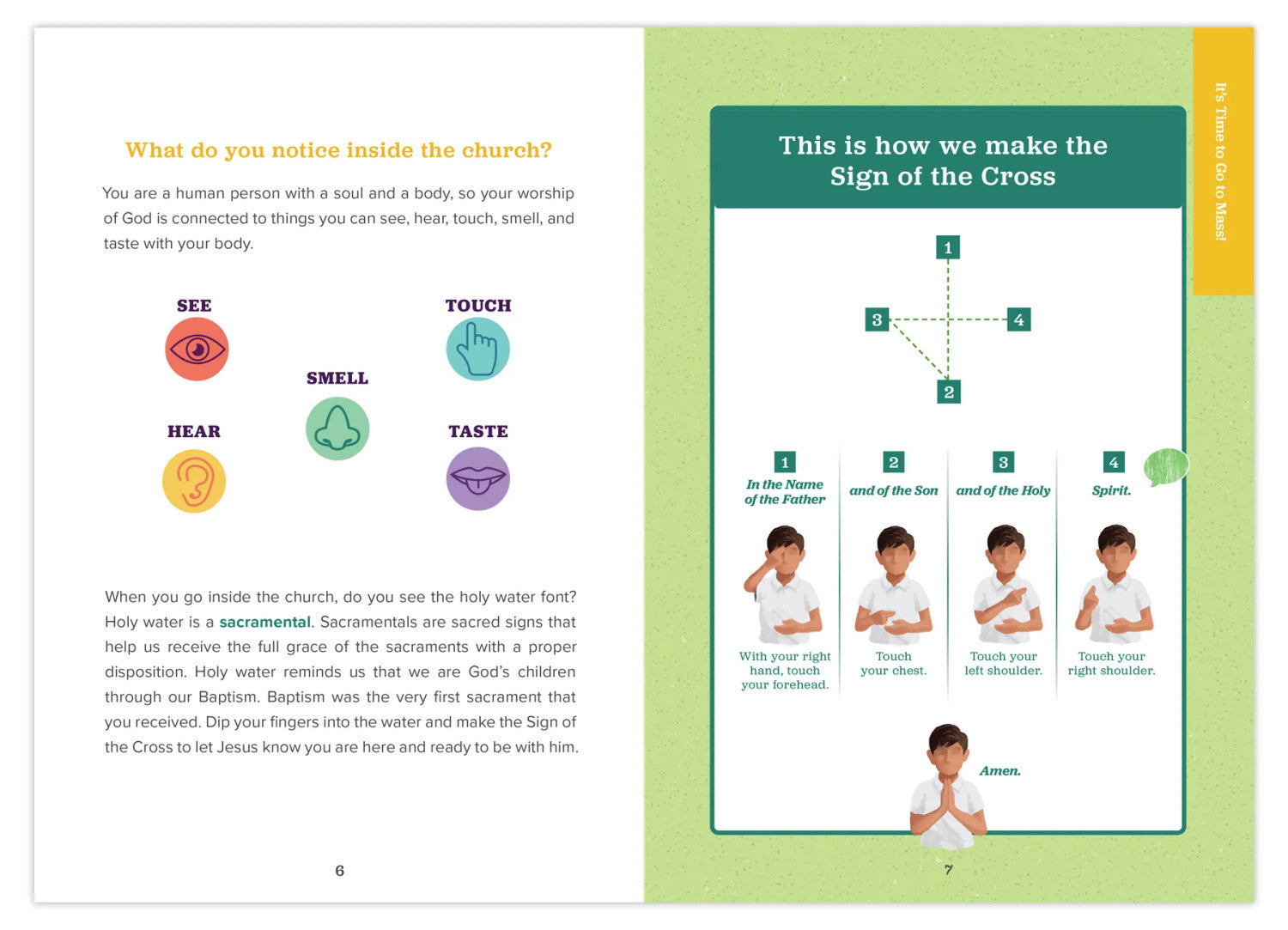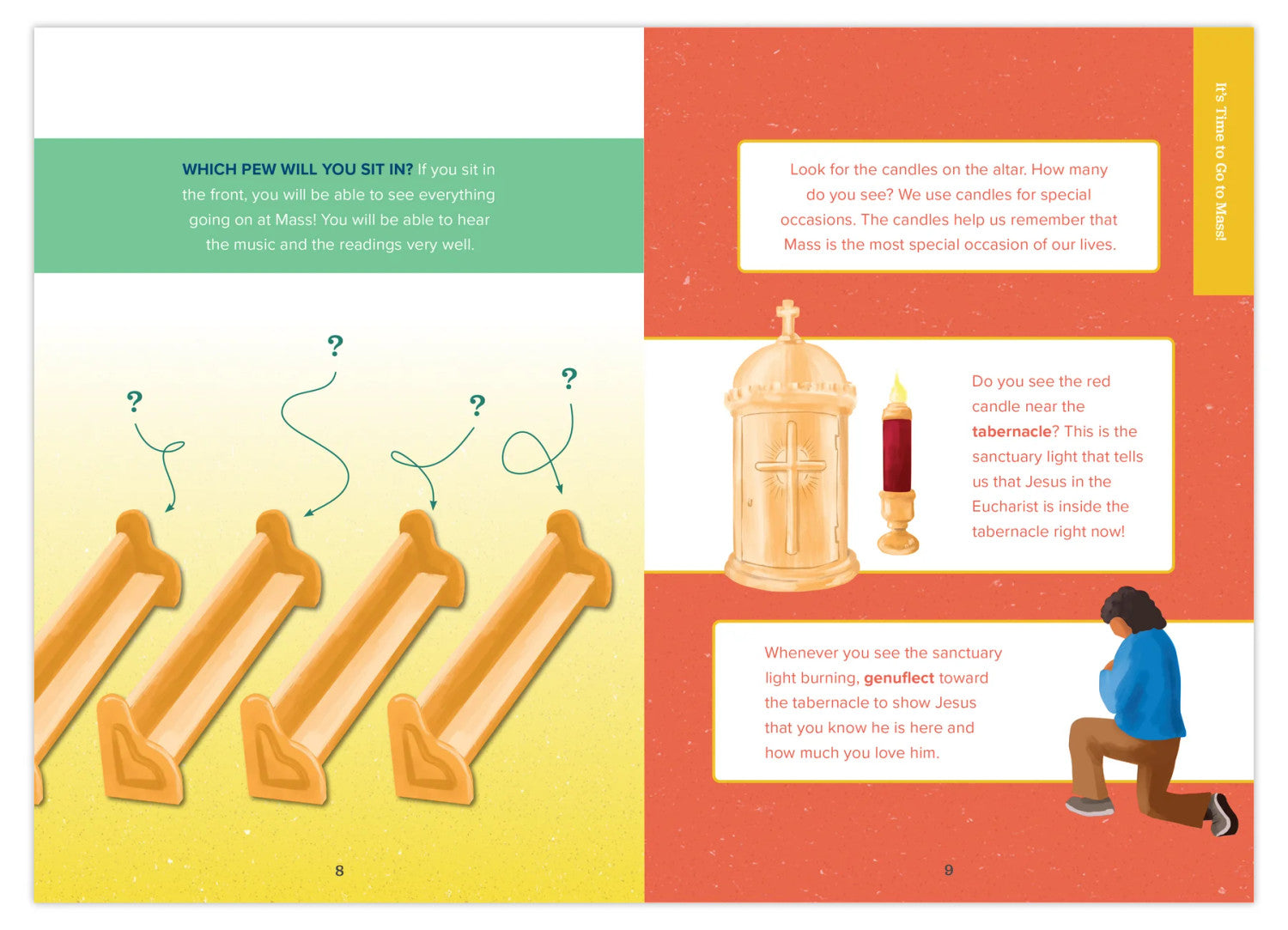 Receiving Jesus: My Guide to the Mass helps children become comfortable going to Mass by showing them not only when to sit, stand, and kneel and what to say but also why we do the things we do at Mass. They’ll learn about the roles of the different people they see at Mass, like the ushers, lectors, cantors, deacons, and priests. This is the perfect book for them to bring to Mass!