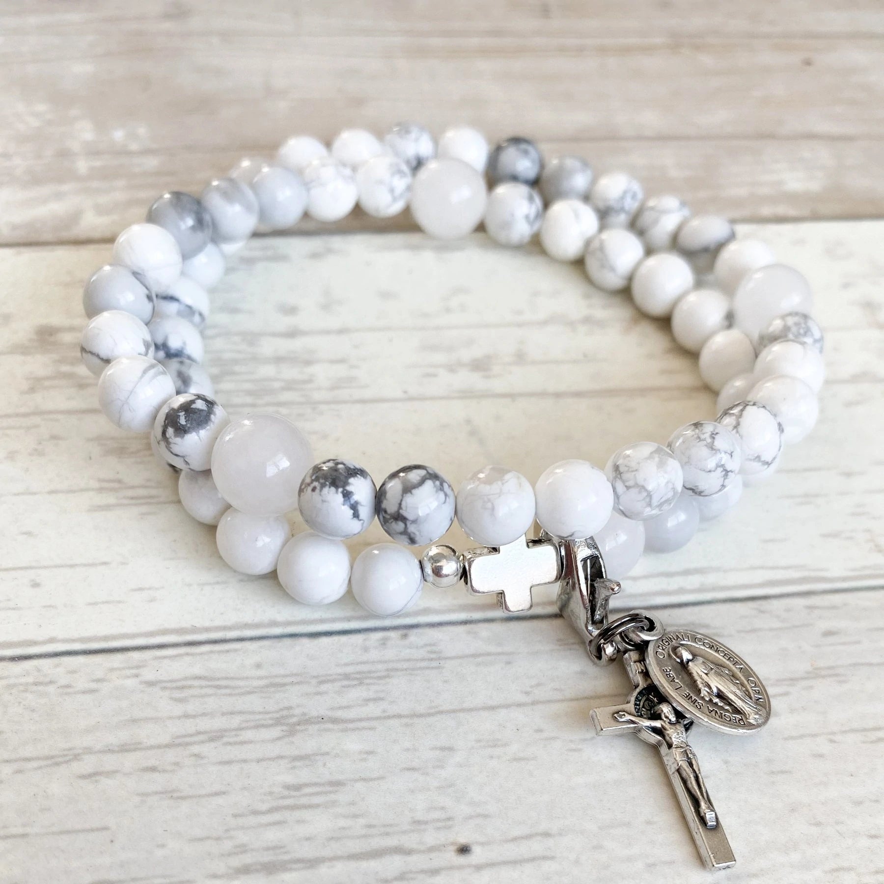 This beautiful gemstone rosary bracelet from Chews Life features Snow Quartz beads as the paters and white Howlite beads as the aves. Each bracelet also includes a crucifix medal clasp that is moveable and can help you keep track of where you are at in your rosary as you pray throughout your day.