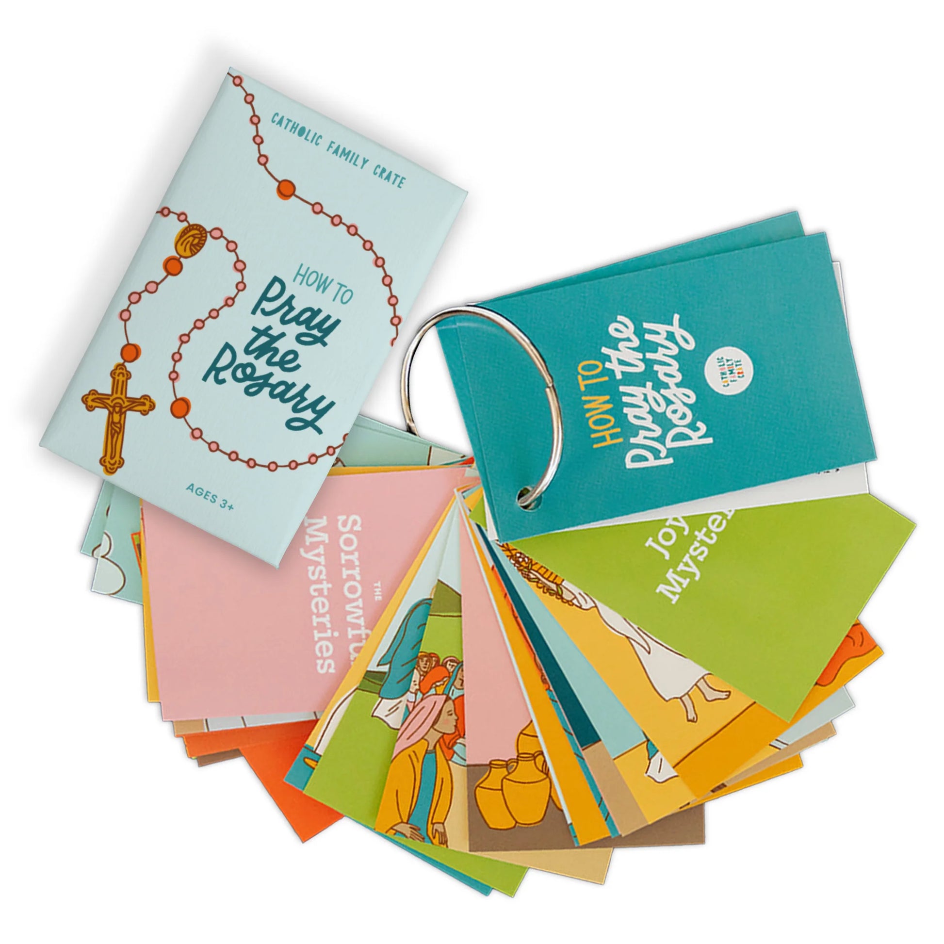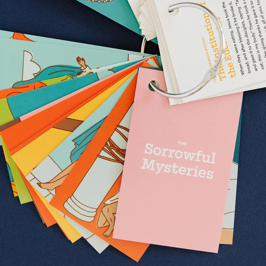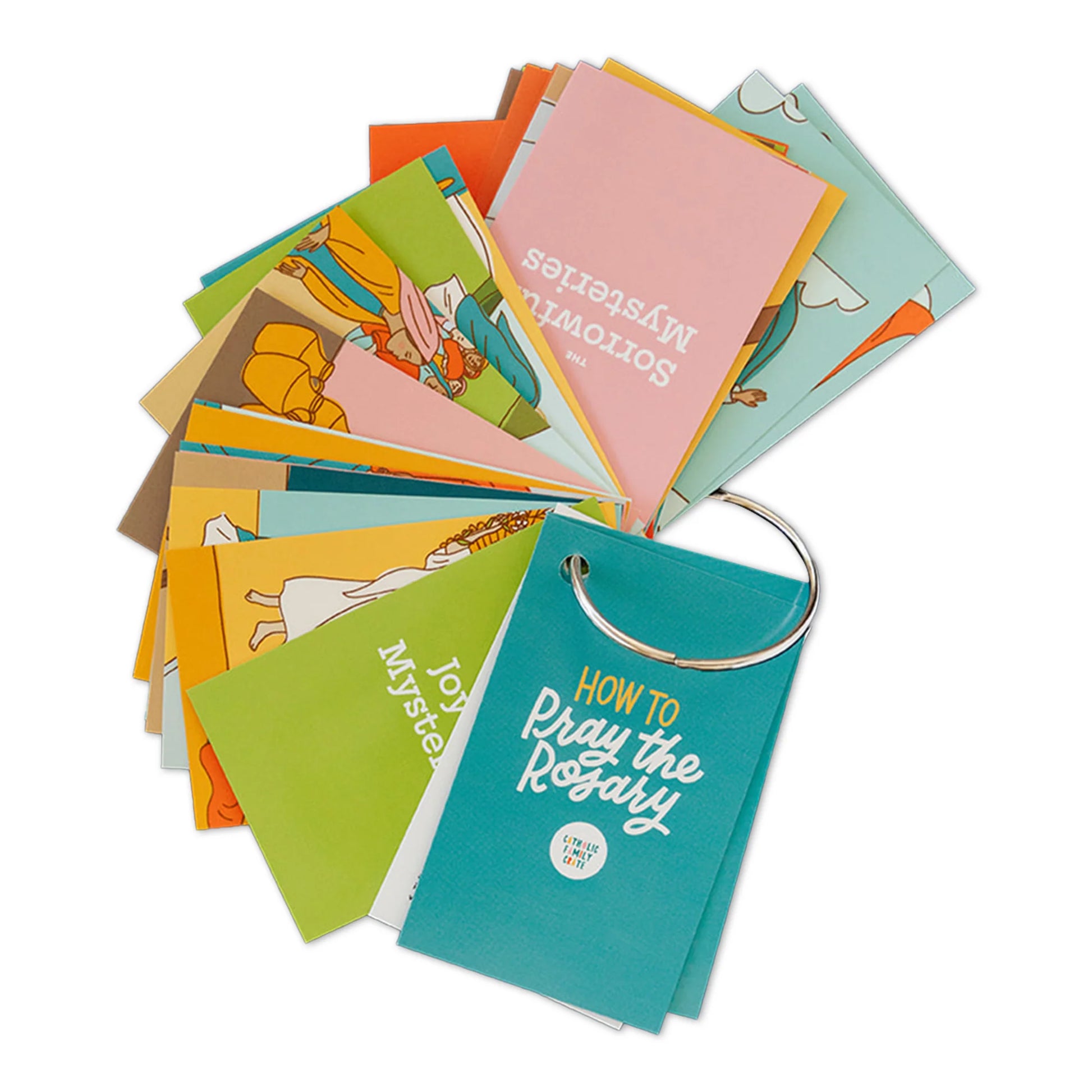 This pocket-sized rosary ring from Catholic Family Crate includes 27 cards that depict the Joyful, Luminous, Sorrowful, and Glorious Mysteries of the rosary through hand-drawn illustrations in vivid colours. Deepen their understanding of each mystery with a simple meditation and scripture references.
