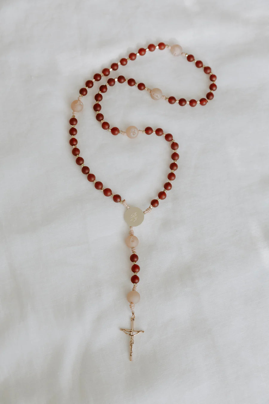The Sacred Heart Rosary is handmade from West Coast Catholic and features red and gold beads with a gold charm centerpiece. This Rosary is designed to draw you closer to God's merciful love, that this love would heal your heart and set it aflame.