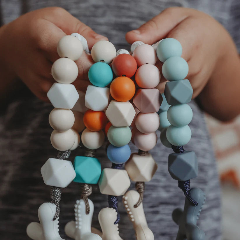 The Esther silicone decade from Chews Life features tones of soft pink and cream beads with an off white cross.
