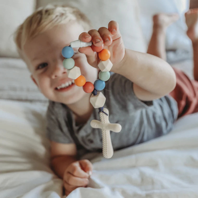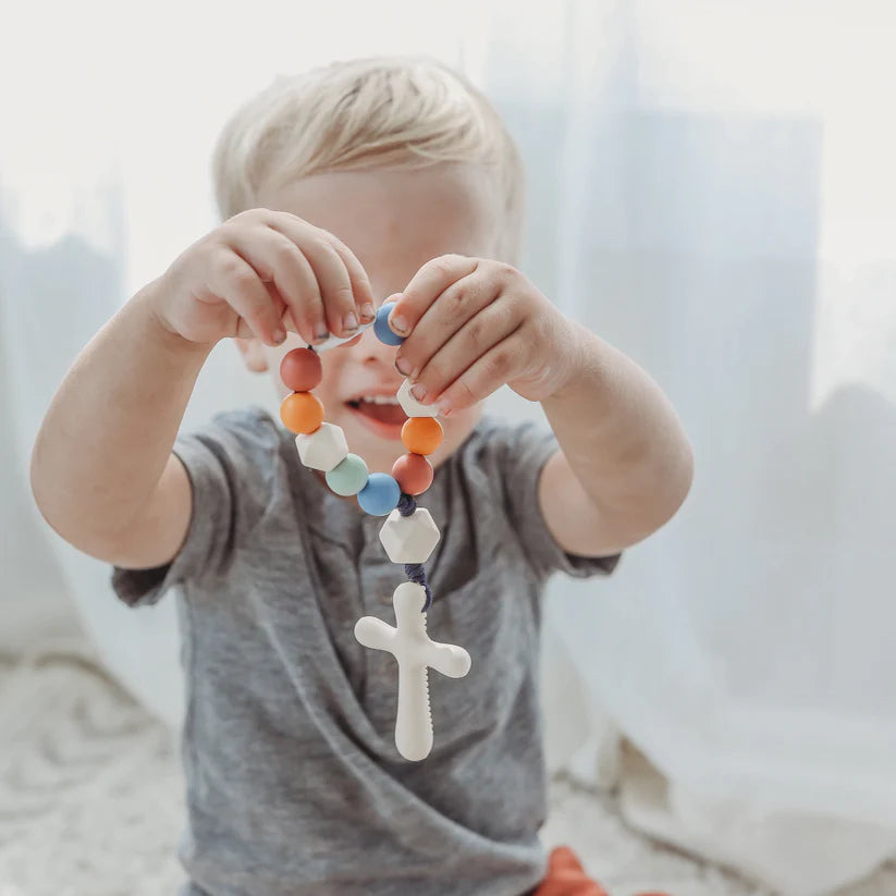 The Genesis silicone decade from Chews Life features multicoloured beads in tones of orange and blue with a white cross.