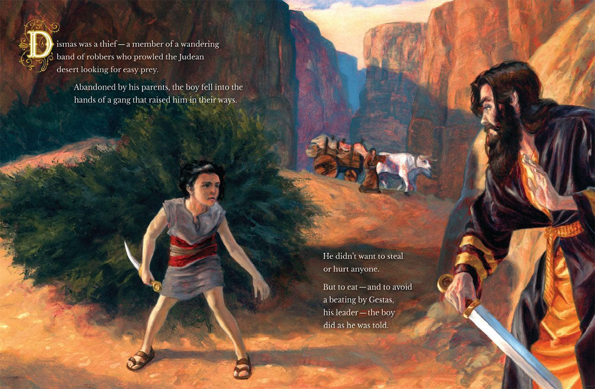 Majestically illustrated by Randy Gallegos, this inspiring story begins when the Holy Family is set upon by roadside thieves. Jesus is a young boy—and the lead bandit is the Bad Thief. His accomplice is a young man named Dismas, later the Good Thief.